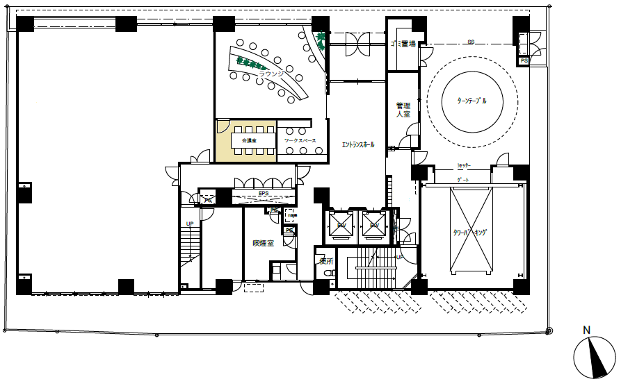 フロアマップ中央部の着色部分が会議室です。ラウンジ内に入り口がございます。
